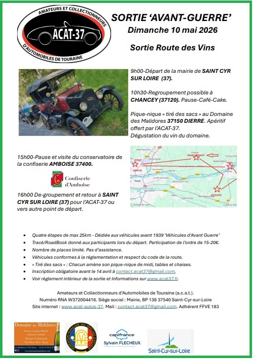 Cette année 2026, afin de faire mieux connaitre les véhicules avant 1939, les « Avant-Guerre », l’ACAT-37 ouvre sa sortie « Avant-Guerre » annuelle aux autres clubs et aux particuliers. Info et inscription mail à contact.acat37@gmail.com